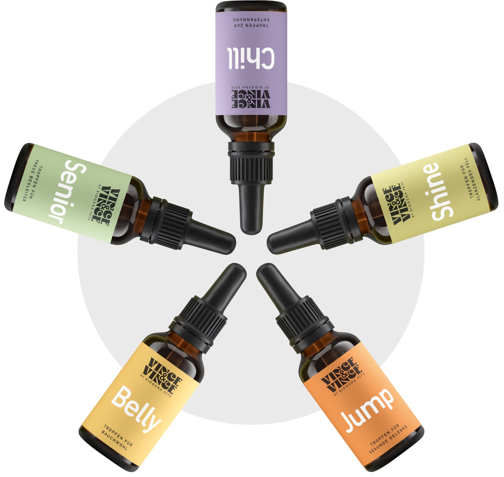 Vince & Vince is a Salzburg-based company that produces functional supplements for dogs. Our Functional Drops provide high-quality, easily dosed and fast-acting micronutrients in liquid form – simply add a few drops to your dog's food. Made in Austria with tested ingredients of uncompromising quality. Because liquid is simply more practical.